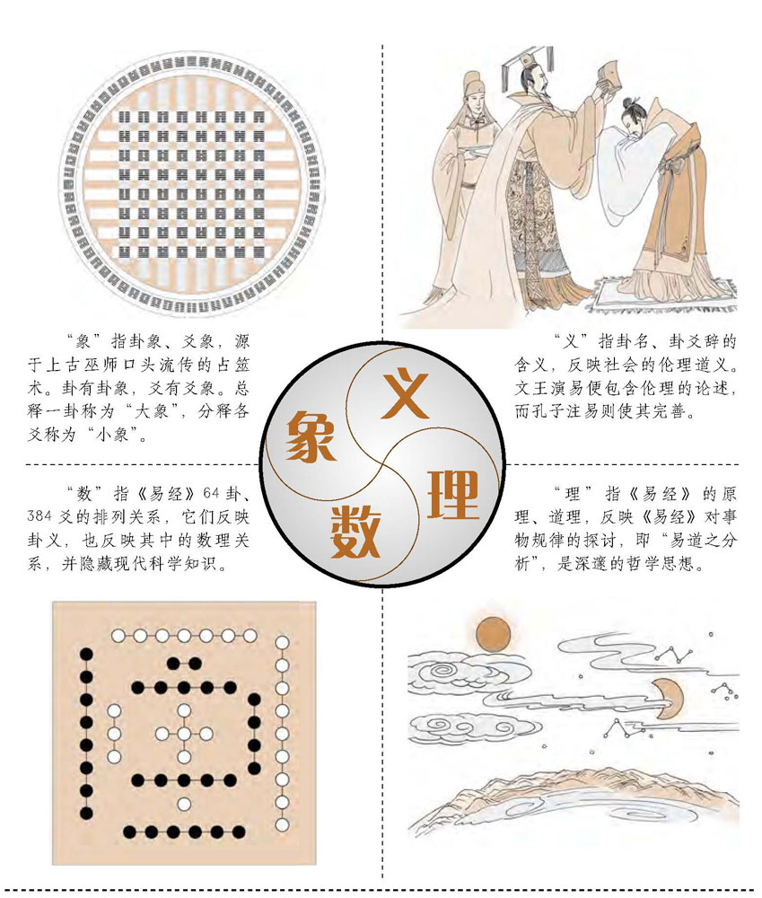 古人将易象、易数、易义、易理称为“易之四德”。简单地说,“象”是卦及其所象征的事物的形象,“数”反映卦象中的数理关系,“义”表达了伦理道义的思想,“理”是对万物的规律所做的探讨。